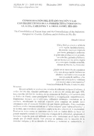 Consolidaciòn del estado-nación y las contradicciones de la perspectiva indianista: Gualda, Cailloma y A orillas del Bío- Bío. [artículo] Amado Láscar Alpha (Revista : Osorno, Chile)-- no. 21 (dic. 2005) p. 63-86 .