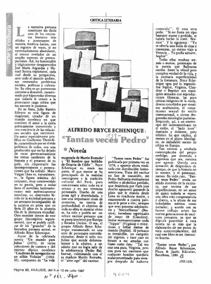 "Tantas veces Pedro" [artículo] / José Leal. Análisis. -- no. 162 (jul. 6, 1987) p. 50 il. .
