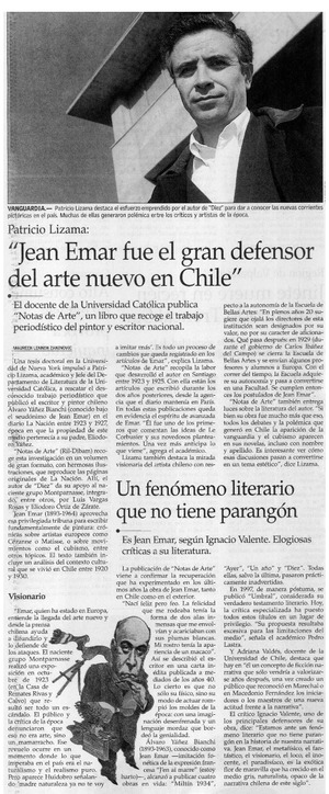 Jean Emar fue el gran defensor del arte nuevo en Chile [artículo] / Maureen Lennon Zaninovic. El Mercurio (Diario : Santiago, Chile)-- jul. 21, 2003, p. C10. retr. .