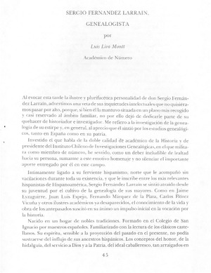 Sergio Fernández Larraín, genealogista [artículo] / Luis Lira Montt. Boletin de la Academia Chilena de la Historia (Santiago, Chile)-- no. 95 (1984) p. 45-48. .