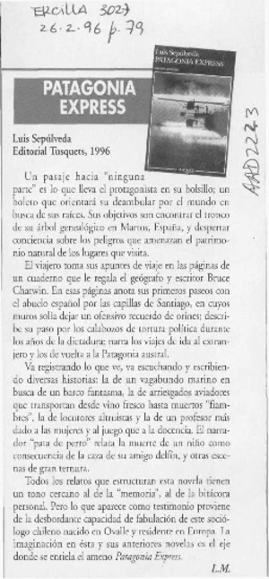 Patagonia express [artículo] / L. M. Ercilla. -- no. 3027 (feb. 26, 1996) p. 79 il. .