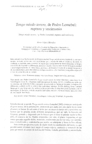Tengo miedo torero, de Pedro Lemebel: ruptura y testimonio [artículo] / Berta López Morales Estudios Filológicos (Revista : Chile)-- no. 40 (sept. 2005) p. 121-129 .