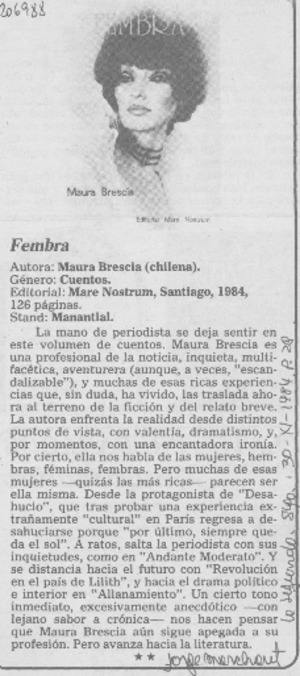 "Fembra" [artículo] / Jorge Marchant. La Segunda. -- nov. 30, 1984, p. 28 il. .