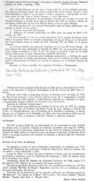 El laudo arbitral de Canal Beagle [artículo] / Alberto Marín Madrid. Revista Chilena de Historia y Geografía (Santiago, Chile)-- no. 146, 1978, p. 350-351. .