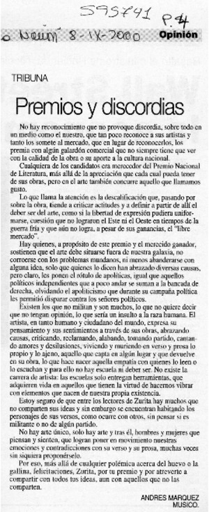 Premios y discordias [artículo] Andrés Marquez La Nación (Santiago) sept. 8, 2000, p. 4 .