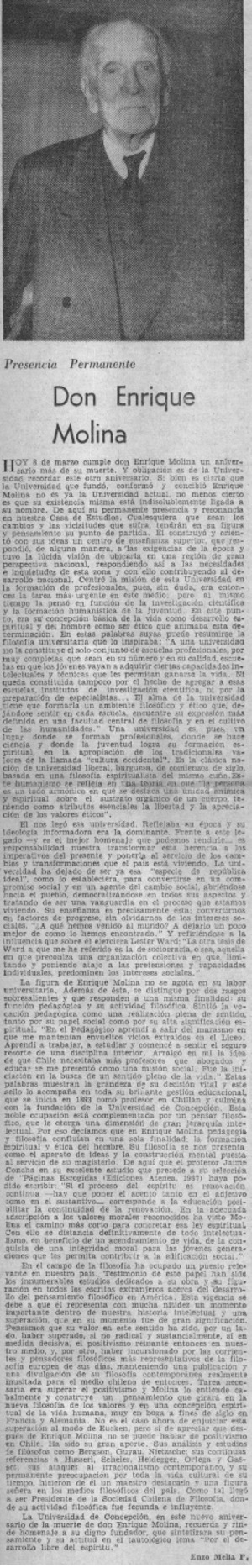 Don Enrique Molina [artículo] / Enzo Mella P. El Sur (diario : Concepción, Chile)-- mar. 8, 1971, p. 3. retr. .