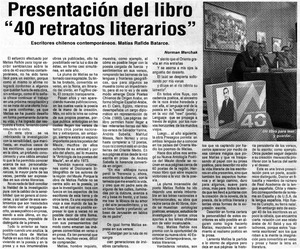 Presentación del libro "40 retratos literarios" [artículo] / Norman Merchak. La Prensa (Diario : Curicó, Chile)-- nov. 21, 2003, p.17. retr. .
