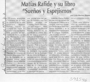 Matías Rafide y su libro "Sueños y espejismos" [artículo] Luis Merino Reyes La Prensa (Curicó) sept. 5, 1999, p. 3 (suplemento) El Rancagüino (Rancagua) oct. 10, 1999, p. 21 .