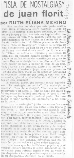 Isla de nostalgias" de Juan Florit, [artículo] / Ruth Eliana Merino. La Unión (Valparaíso, Chile)-- nov. 7, 1971, p. 2 (suplemento). .