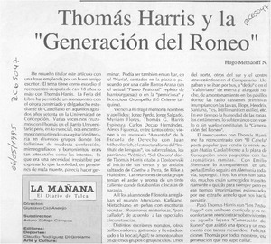 Tomás Harris y la "Generación del roneo" [artículo] / Hugo Metzdorff N. La Mañana. -- mayo 6, 1995, p. 6. .