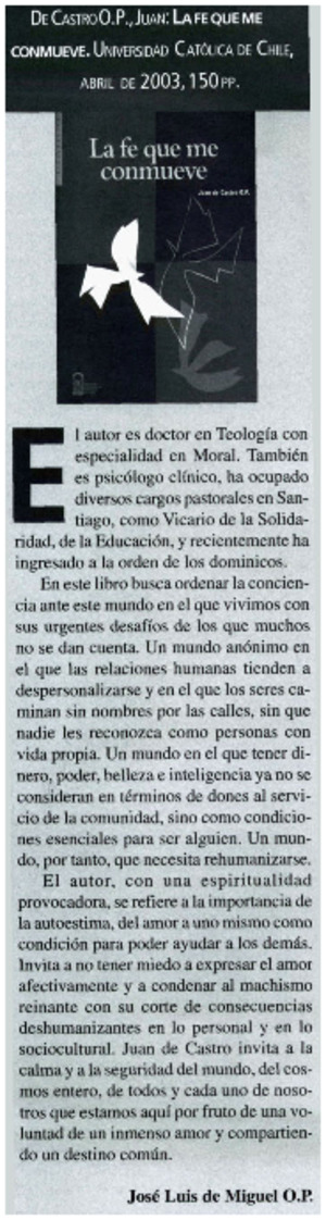 La fe que me conmueve [artículo] / José Luis de Miguel. Mensaje (Santiago, Chile)-- no. 520 (jul. 2003) p. 55. il. .