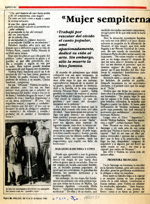 "Mujer sempiterna, violeta terrestre" [artículo] / Alejandra Miranda. Análisis. -- no. 214 (feb. 15, 1988) p. 36-38 retr. .