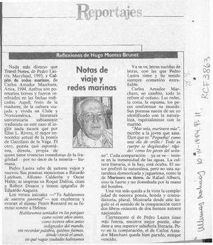 Notas de viaje y redes marinas [artículo] / Hugo Montes Brunet. Las Últimas Noticias (Diario : Santiago, Chile)-- abr. 10, 1994, p. 11 retr. .