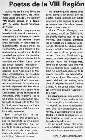 Poetas de la VII región [artículo] / Benjamín MOrgado. La Nación (Diario : Santiago, Chile)-- dic. 25, 1983, p. 3. .