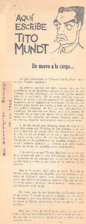 De nuevo a la carga... [artículo] / Tito Mundt. El Rancagüino (Rancagua, Chile)-- jul. 10, 1969. retr. .