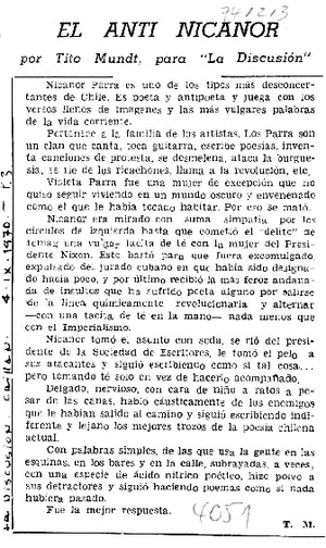 El anti Nicanor [artículo] / Tito Mundt. La Discusión (Diario : Chillán, Chile)-- sept. 4, 1970, p. 3. .