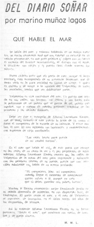 Que hable el mar [artículo] / Marino Muñoz Lagos. El Magallanes (Punta Arenas, Chile)-- ago. 2, 1971, p. 3. .