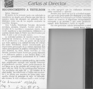 Reconocimiento a Teitelboim [artículo] Carlos Muñoz Núñez La Discusión (Chillán) sept. 4, 2002, p. 3 .