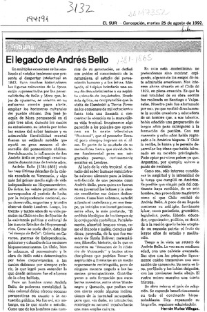 El legado de Andrés Bello [artículo] / Hernán Muñoz Villegas. El Sur (diario : Concepción, Chile)-- ago. 25, 1992, p. 6. .