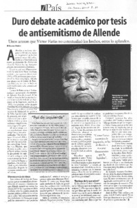 Duro debate académico por tesis de antisemitismo de Allende [artículo] / Ximena Muñoz. Diario Siete (Diario : Santiago, Chile) abr. 11, 2005, p. 10. .