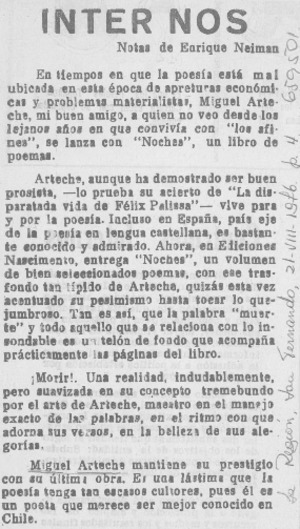 Inter Nos [artículo] / Enrique Neiman. La Región (San Fernando, Chile)-- ago. 21, 1976, p. 4. .