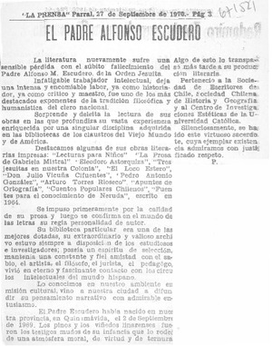 El padre Alfonso Escudero [artículo] / P. La Prensa (Parral, Chile)-- sept. 27, 1970, p. 3. .