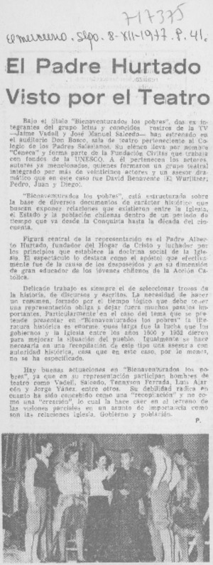 El padre Hurtado visto por el teatro. [artículo] El Mercurio (Diario : Santiago, Chile)-- dic. 8, 1977, p. 41. retr. .