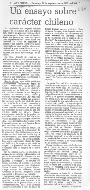 Un ensayo sobre carácter chileno [artículo] / Modesto Parera. El Mercurio (Diario : Valparaíso, Chile)-- sept. 18, 1977, p. C. .