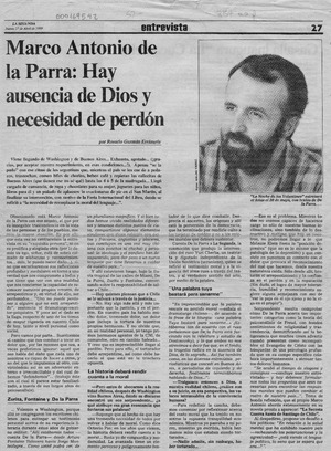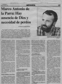 Marco Antonio de la Parra, "Hay ausencia de Dios y necesidad de perdón" [artículo] / Rosario Guzmán Errázuriz. La Segunda. -- abr. 27, 1989, p. 27 retr. .