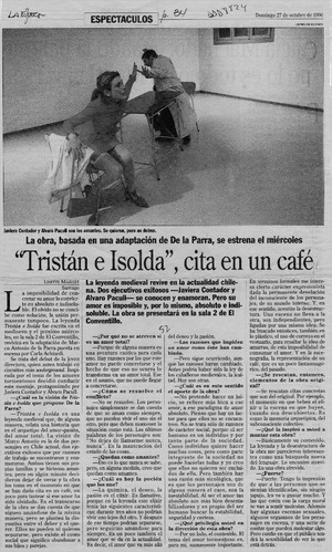 "Tristán e Isolda", cita en un café [artículo] / Lisette Maillet. La Epoca. -- oct. 27, 1996, p. 34 retr. .
