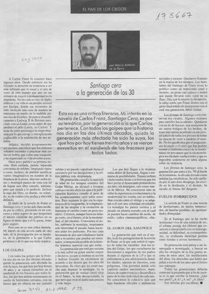 Santiago cero o la generación de los 30 [artículo] / Marco Antonio de la Parra. Caras. -- no. 47 (ene. 31, 1990) p. 73 retr. .
