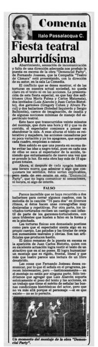 Fiesta teatral aburridísima [artículo] / Italo Passalacqua C. La Segunda (Diario : Santiago, Chile)-- oct. 20, 1983, p. 43. retr. .