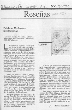 Pichilemu, mis fuentes de información [artículo] / Manuel Peña Muñoz. El Mercurio (Santiago). -- feb. 24, 1991, p. 6 (suplemento) il. .