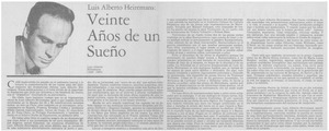 Veinte años de un sueño [artículo] / Manuel Peña Muñoz. El Mercurio (Santiago). -- jun. 24, 1984, p. E4 El Mercurio (Valparaíso). -- jul. 11, 1984, p. 2. retr. .