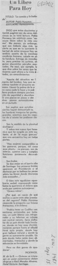 Lo comido y lo bailado [artículo] / Pickwick. Las Últimas Noticias (Diario : Santiago, Chile)-- sept. 15, 1981, p. 15. .