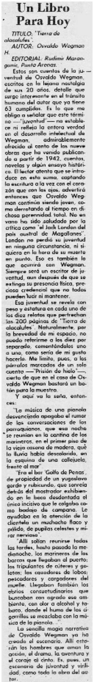 "Tierra de alacalufes" [artículo] / Pickwick. Las Últimas Noticias (Diario : Santiago, Chile)-- jun. 7, 1981. .