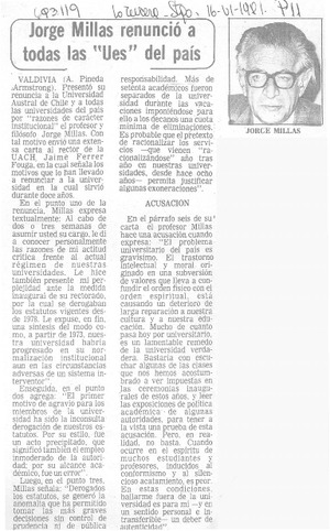 Jorge Millas renunció a todas las "Ues" del país [artículo] / A. Pineda Armstrong. La Tercera (Santiago, Chile)-- jun. 16, 1981, p. 11. retr. .