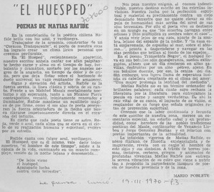 El huésped" [artículo] / Mario Poblete. La Prensa (Curicó, Chile)-- mar. 19, 1970, p. 3. .