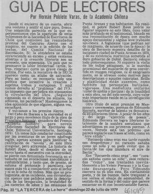 Guía de lectores [artículo] / Hernán Poblete Varas. La Tercera de La Hora (Diario : Santiago, Chile)-- jul 22, 1979, p. 22. .