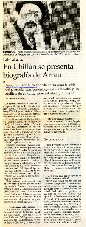 En Chillán se presenta biografía de Arrau [artículo] / Susana Ponce de León G. El Mercurio (Santiago, Chile)-- ago. 7, 2002, p. C12. retr. .