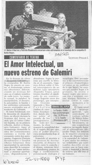 El amor intelectual, un nuevo estreno de Galemiri [artículo] / Leopoldo Pulgar I. La Tercera. -- jun. 25, 1999, p. 47 retr. .