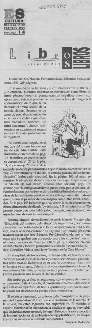 El aire visible [artículo] / Fernando Quilodrán. El Siglo (diario : Santiago, Chile)-- ( feb. 5, 1994) p. 14 .