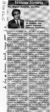 "A través del espejo" [artículo] Miguel Ramírez La Voz de Arauco (Cañete) mayo 2000, p. 2 retr. .