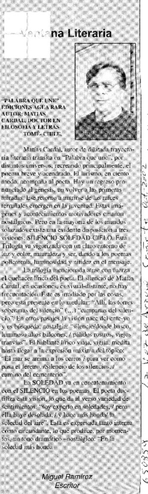 Palabra que une [artículo] Miguel Ramírez La Voz de Arauco (Cañete) oct. 2002, p. 2 retr. .