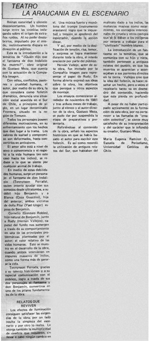 Teatro la Araucana en el escenario [artículo] / María Eugenia Ramírez O. El Rancagüino (Rancagua, Chile)-- jul. 28, 1982, p. 4. .