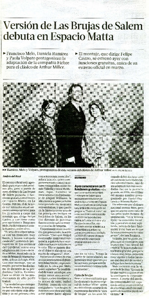 Versiòn de Las Brujas de Salem debuta en espacio Matta [artículo] / Andrès del Real. La Tercera (Diario : Santiago, Chile)-- oct. 28, 2011, p. 87 .