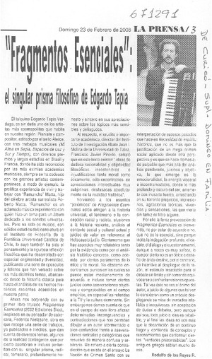 Fragmentos esenciales", el singular prisma filosófico de Edgardo Tapia [artículo] / Rodolfo de los Reyes R. La Prensa (Curicó, Chile)-- feb. 23, 2003, p. 3 (suplemento "Domingo en familia") retr. .