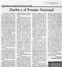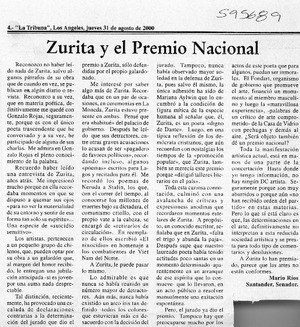 Zurita y el Premio Nacional [artículo] Mario Ríos Santander La Tribuna (Los Ángeles) ago. 31, 2000, p. 4 .