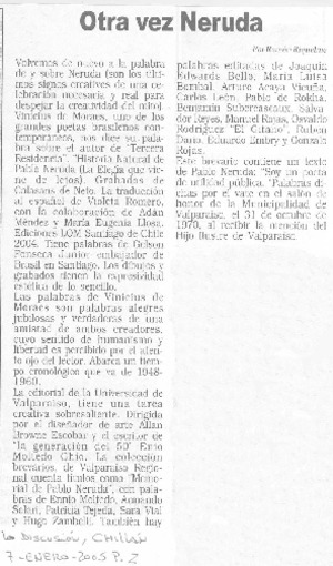 Otra vez Neruda [artículo] / Ramón Riquelme. La Discusión (Diario : Chillán, Chile)-- ene. 7, 2005, p. 2. .