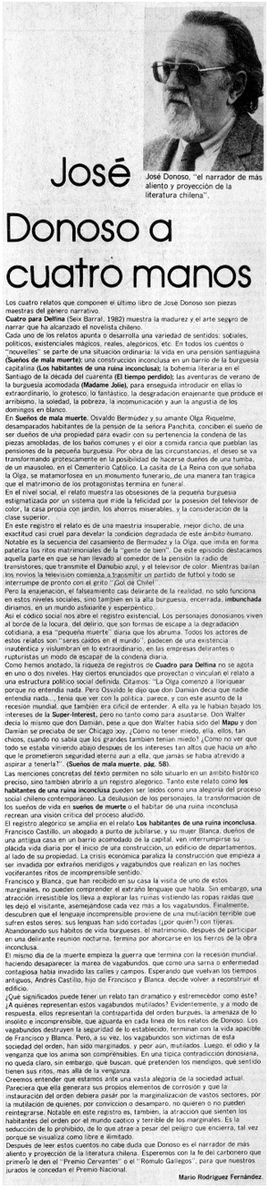 José Donoso a cuatro manos [artículo] / Mario Rodríguez Fernández. El Sur (diario : Concepción, Chile)-- mar. 25, 1984, p. II retr. .